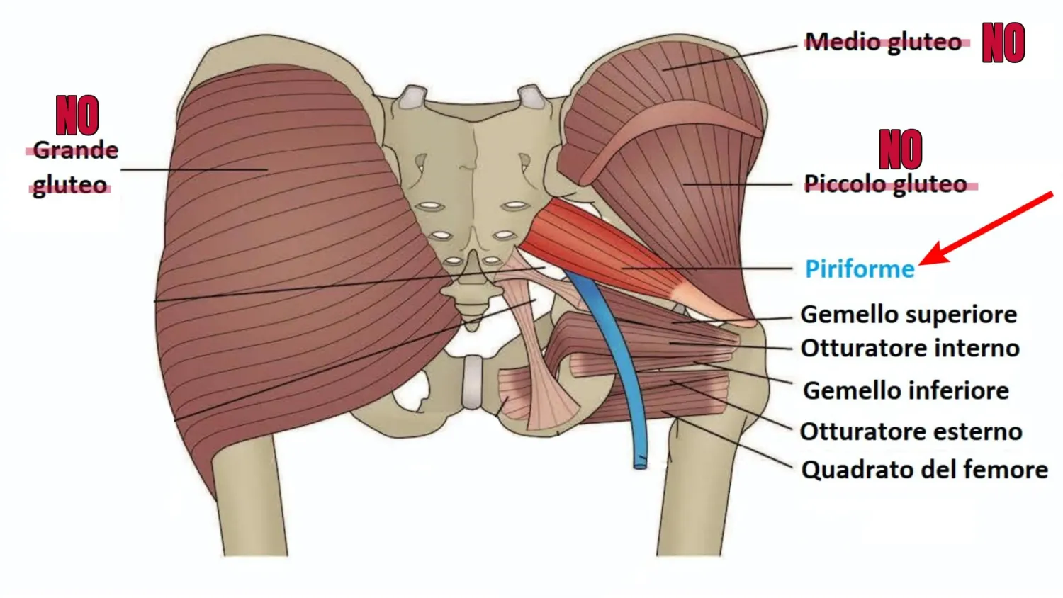 Con l’abduction machine i GLUTEI NON LAVORANO, ciò che lo fa (perché si allineano con il movimento dal centro all’esterno) sono i muscoli come il Piriforme e gli altri rotatori esterni dell’anca (posizionati sotto i glutei come vedi nella foto in basso):