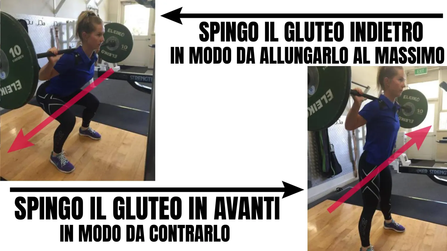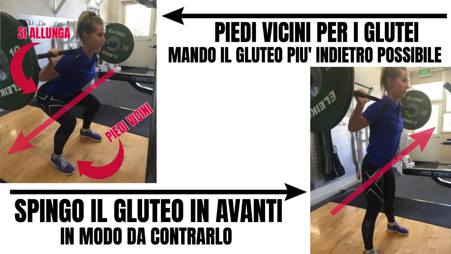 Prendendo lo squat, bisogna farlo tenendo i piedi vicini (circa all’ampiezza del bacino o leggermente più ampi) e cercare di mandare il gluteo il più indietro possibile, in questo modo: