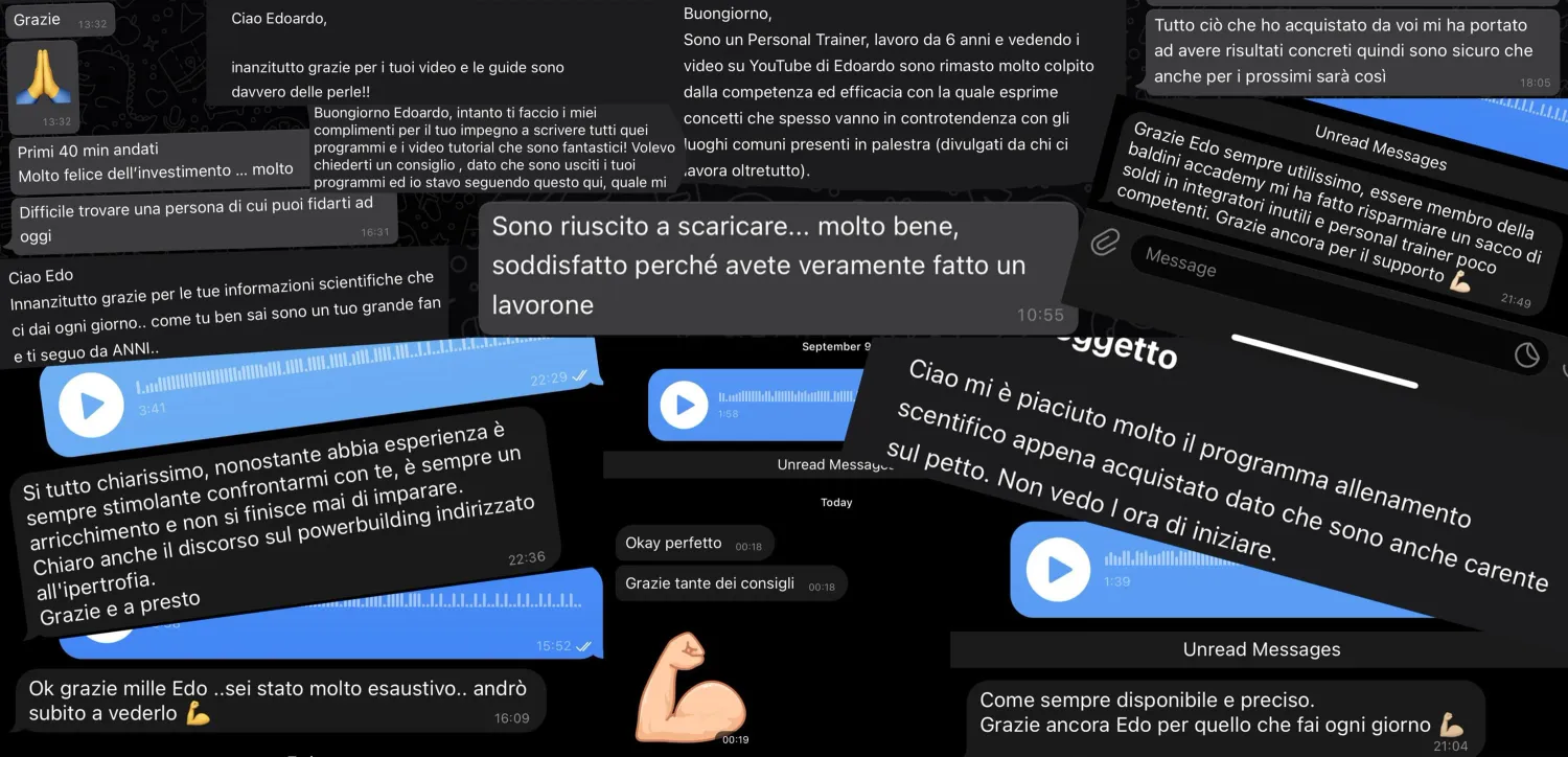 Valuto tantissimo il mio tempo, ma ho deciso comunque di dare accesso direttamente a me attraverso il supporto prioritario Telegram, attraverso il quale potremo valutare insieme i tuoi obiettivi, vedere le tue domande su alimentazione, allenamento e integrazione e modificare qualcosa qualora ce ne fosse il bisogno etc...