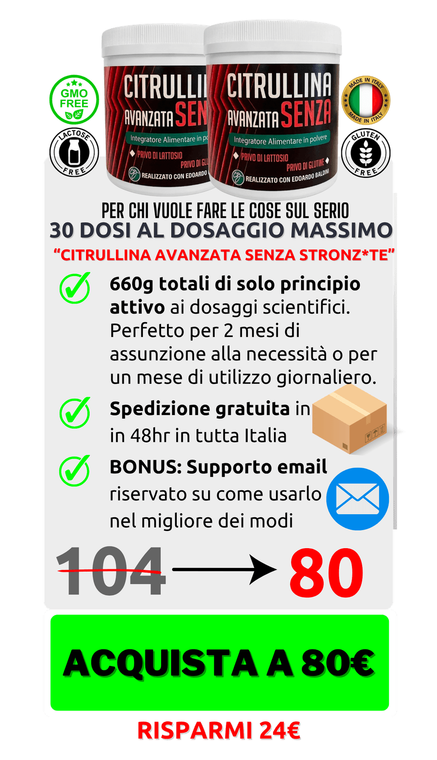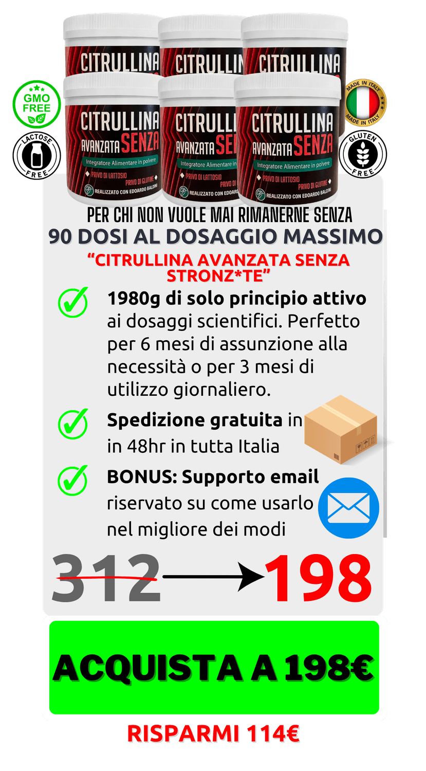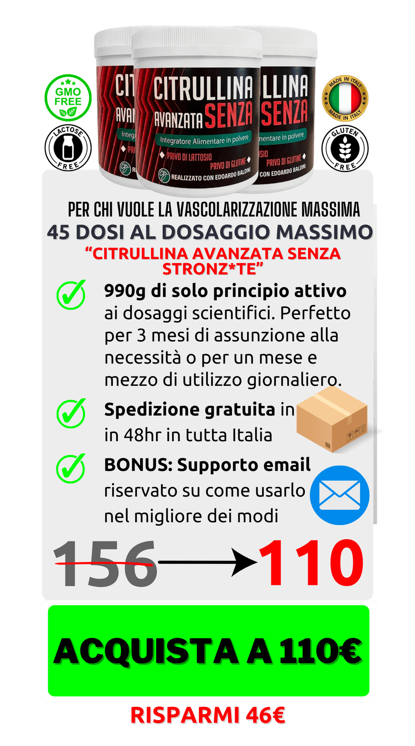 Ad oggi non c'è nessuna dimostrazione scientifica che la Citrullina Malato sia superiore alla l-Citrullina pura. È più diffusa perché costa meno — non perché funzioni meglio. Scegliendo l-Citrullina pura, paghi solo ciò che funziona davvero.