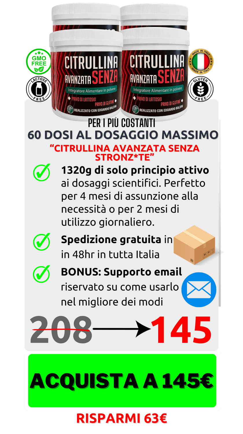 Questa combo agisce su entrambi i fronti simultaneamente: Testosterone + Libido (Duro Duro) e Ossido Nitrico + vascolarizzazione (Citrullina Avanzata).